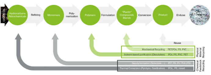 Le recyclage chimique est souvent divisé en trois groupes principaux ; représentées par les trois dernières flèches du graphique :